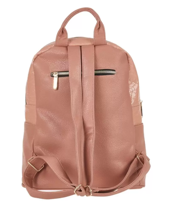 Τσάντα πλάτης από συνθετικό δέρμα υψηλής ποιότητας δύο υφών και δύο τσέπες στην μπροστινή όψη με τέσσερα φερμουάρ. Κλείνει με φερμουάρ και στο εσωτερικό της υπάρχουν δύο πλαϊνά βοηθητικά τσεπάκια, το ένα εκ των οποίων κλείνει με φερμουάρ. Στα πλαϊνά υπάρχουν επιπλέον τσεπάκια και στην πίσω όψη τσέπη με φερμουάρ.