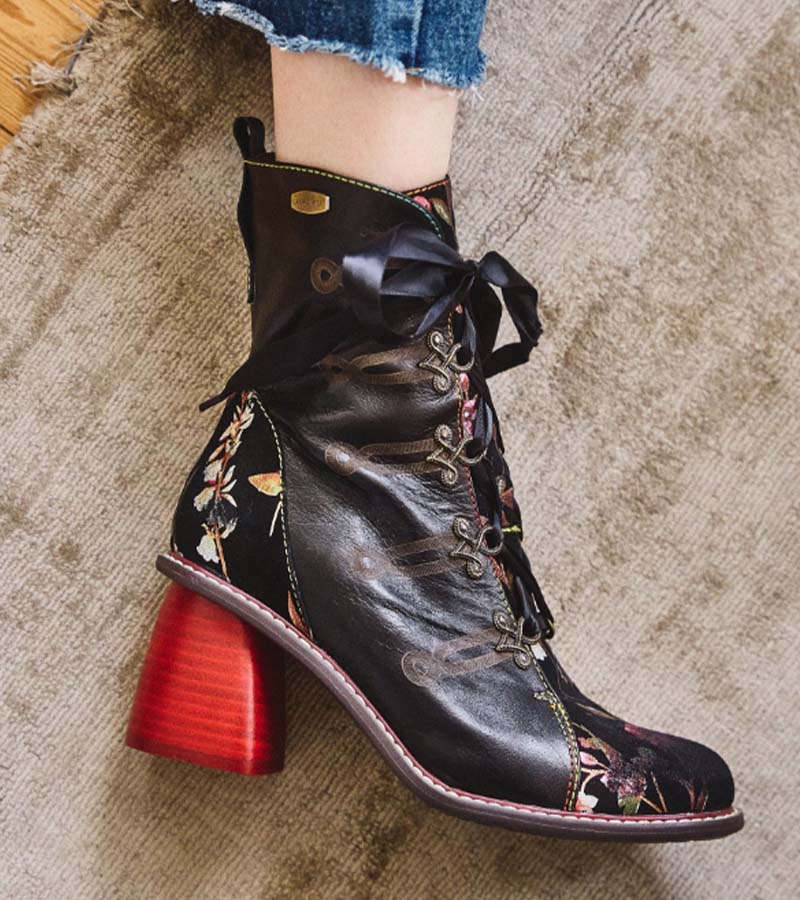 Το επάνω μέρος είναι κατασκευασμένο από φυσικό δέρμα, με φλοράλ λεπτομέρειες. Με πλαϊνό φερμουάρ και κλείσιμο με κορδόνια που όχι μόνο εξασφαλίζει τέλεια εφαρμογή, αλλά προσθέτει και μια πινελιά κομψότητας. Με δερμάτινο εσωτερικό διασφαλίζοντας κάθε φορά την άνεση.