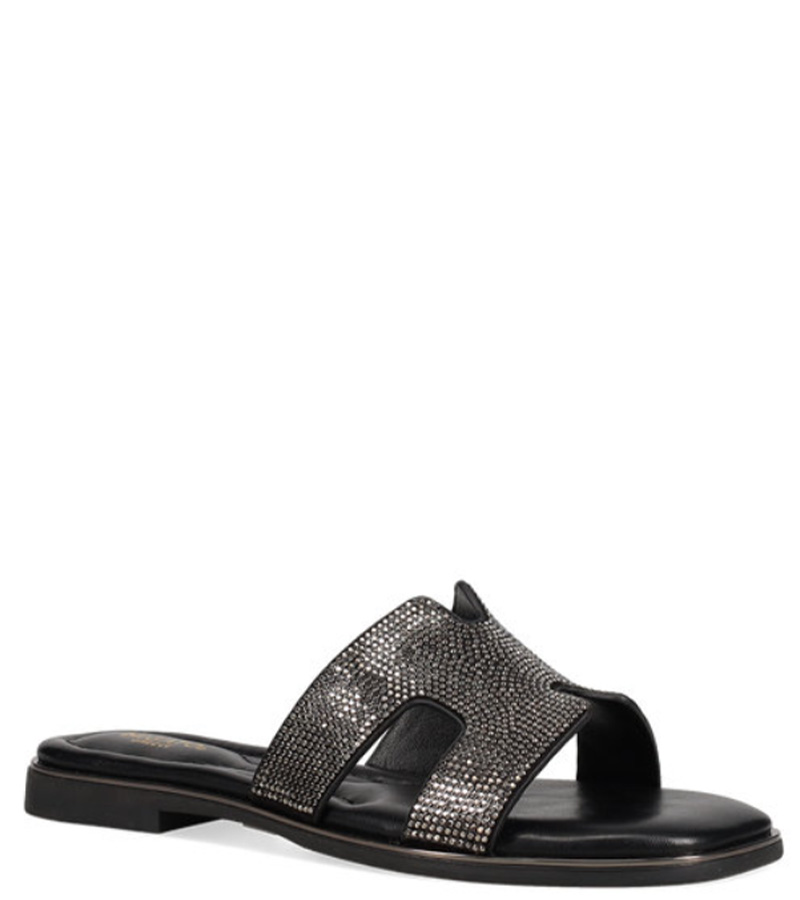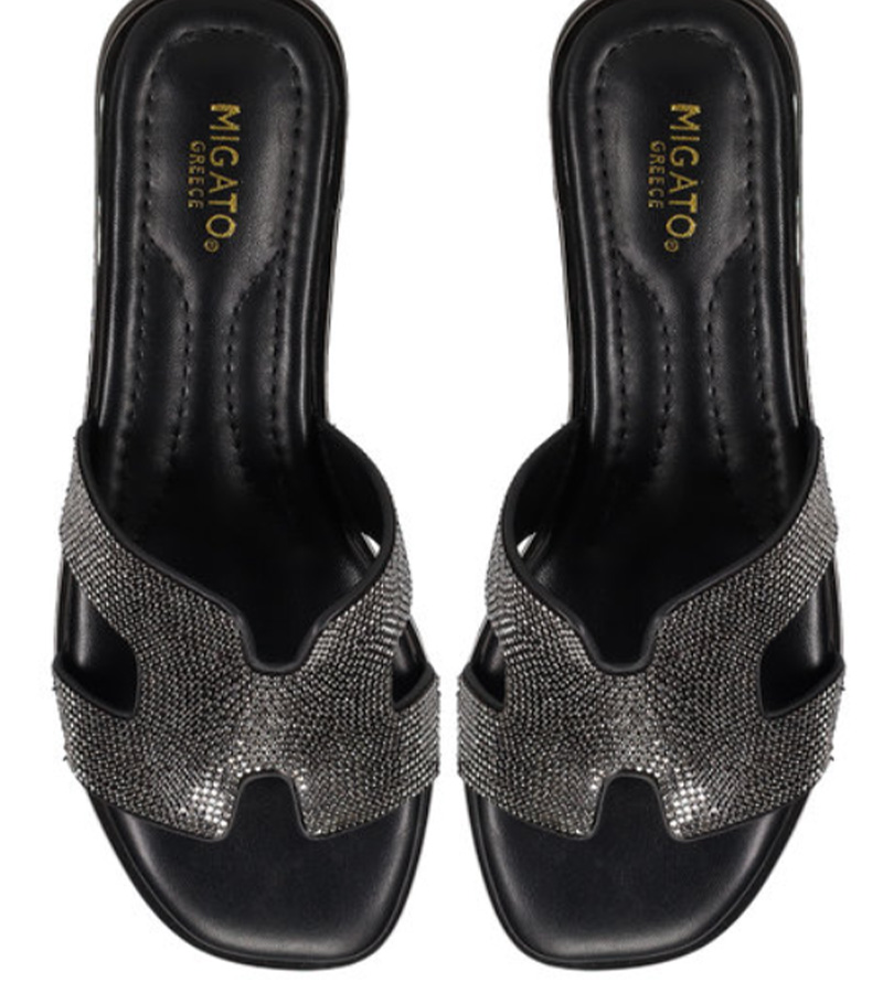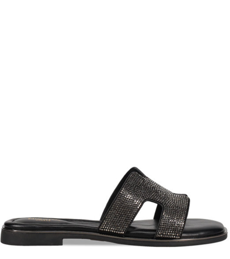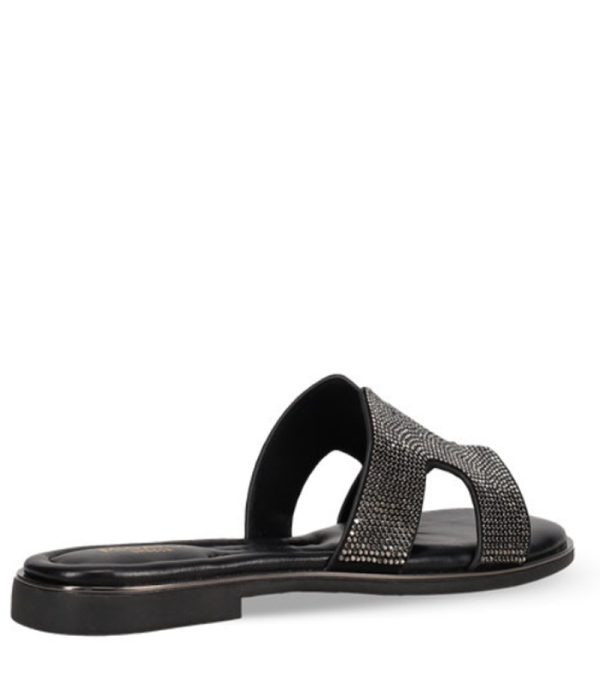 Μαύρο σανδάλι. Διαθέτει φαρδιά φάσα διακοσμημένη με στρας.