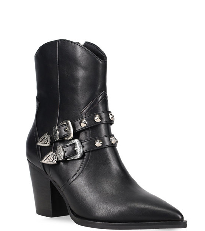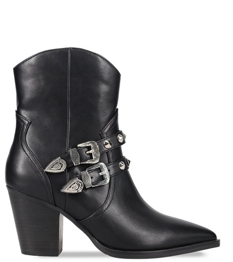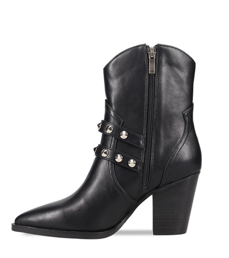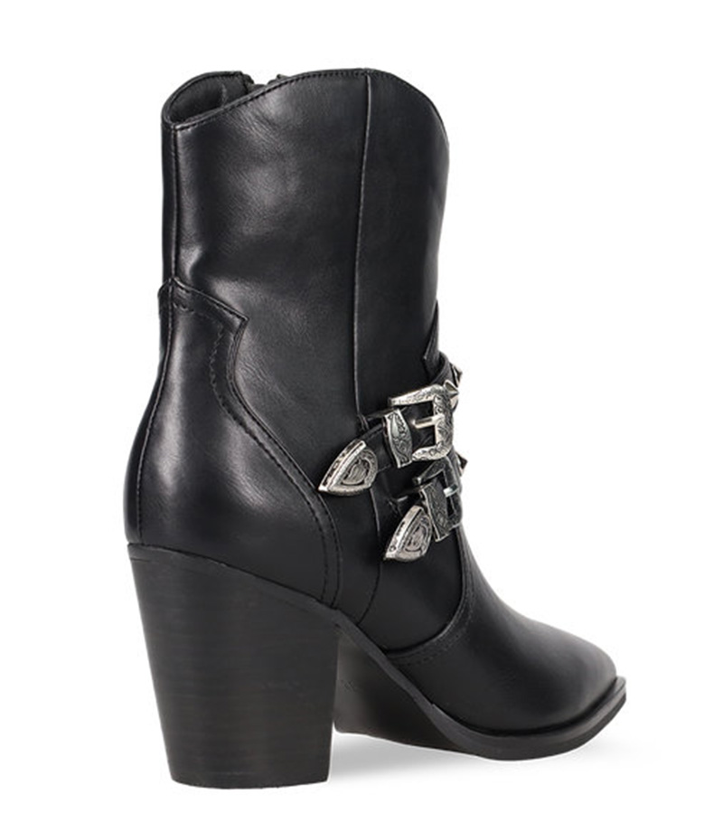 Μαύρο western μποτάκι μέχρι πάνω από τον αστράγαλο. Διαθέτει διακοσμητικά λουράκια με ασημί αγκράφες και κωνικό τακούνι. Κλείνει με φερμουάρ στο πλάι.
