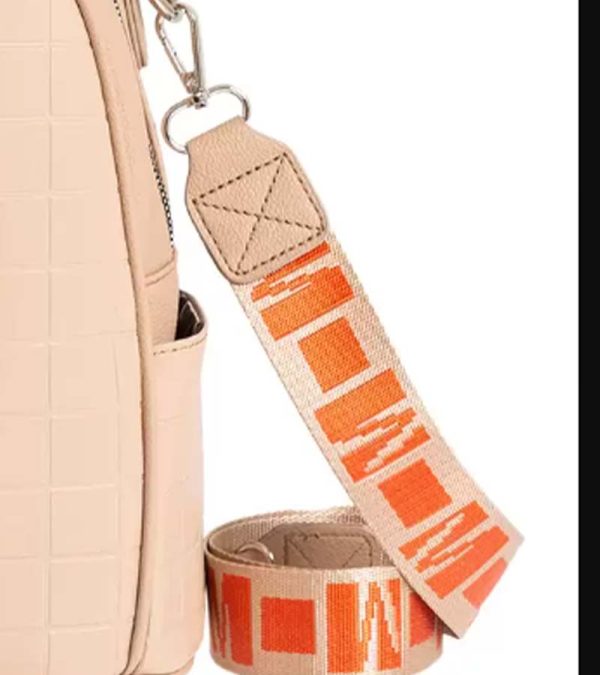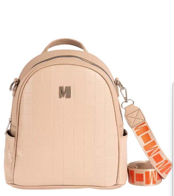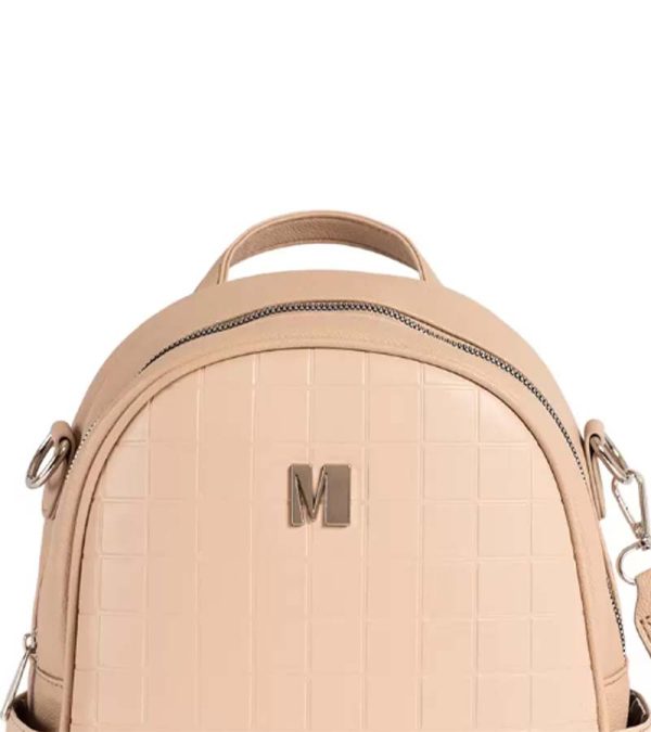Γυναικεία τσάντα πλάτης από ανθεκτικό συνθετικό δέρμα με ανάγλυφη υφή στην μπροστινή όψη. Κλείνει με φερμουάρ και στο εσωτερικό της υπάρχουν τρία πλαϊνά βοηθητικά τσεπάκια, το ένα εκ των οποίων κλείνει με φερμουάρ. Στα πλαϊνά της υπάρχουν εξωτερικές τσέπες και στην πίσω όψη τσέπη με φερμουάρ. Περιέχει επιπλέον κοντό λουράκι από δίχρωμο ιμάντα με λογότυπο για εφαρμογή στον ώμο.