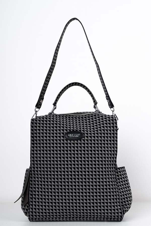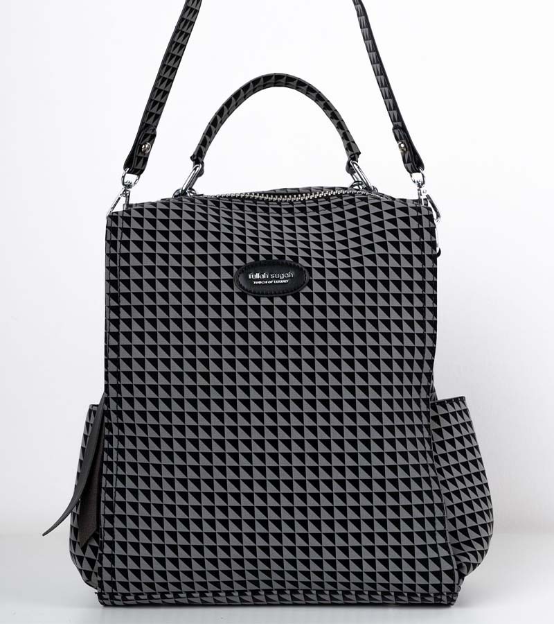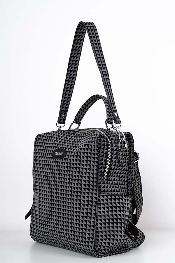 Τσάντα πλάτης από μαλακό συνθετικό δέρμα με γεωμετρικό μοτίβο. Πολλαπλές εφαρμογές με διαφορετικούς ιμάντες. Ενιαίος αποθηκευτικός χώρος. Εξωτερικές θήκες στο πλάι. Κλείνει στο πάνω μέρος με φερμουάρ. Σύνθεση : 100% PU. ΠΧΒΧΥ : 30Χ11,50X29.